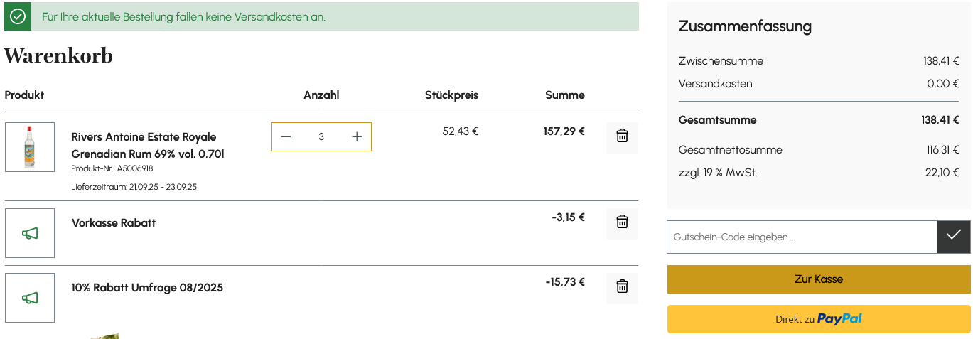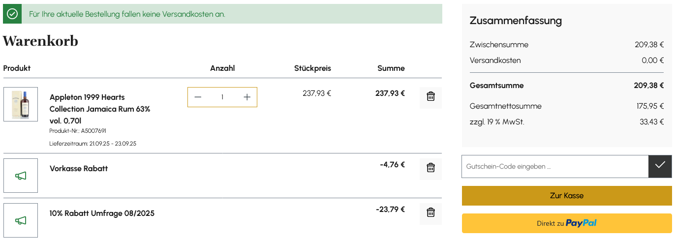 Das Rum Depot hat 10% auf alles, Code GRF2025 - wird aber auch automatisch an der Kasse abgezogen. Gibt ein paar nette Kurse auf Mixer und RumClub Abfüllungen. Schade, dass man das nicht über die App einbinden bzw bestellen kann