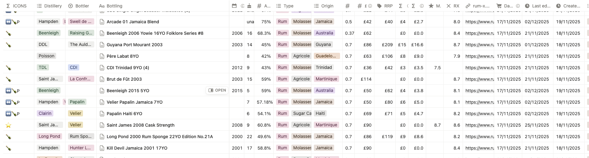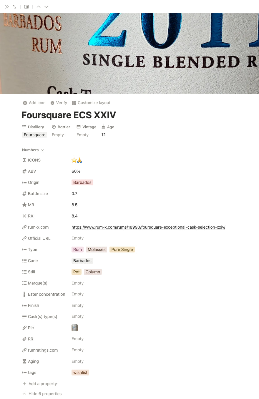 I’ve got a proper Notion doc with all my spirits but I need to make a copy with less PII and things I’d rather keep private. Also that doc uses a lot of abbreviations that would need explanation. It’s been a while I meant to share it as I think it could be useful for other people as a template to manage their own collection. I’ll add a few screenshot below to give you an idea.]